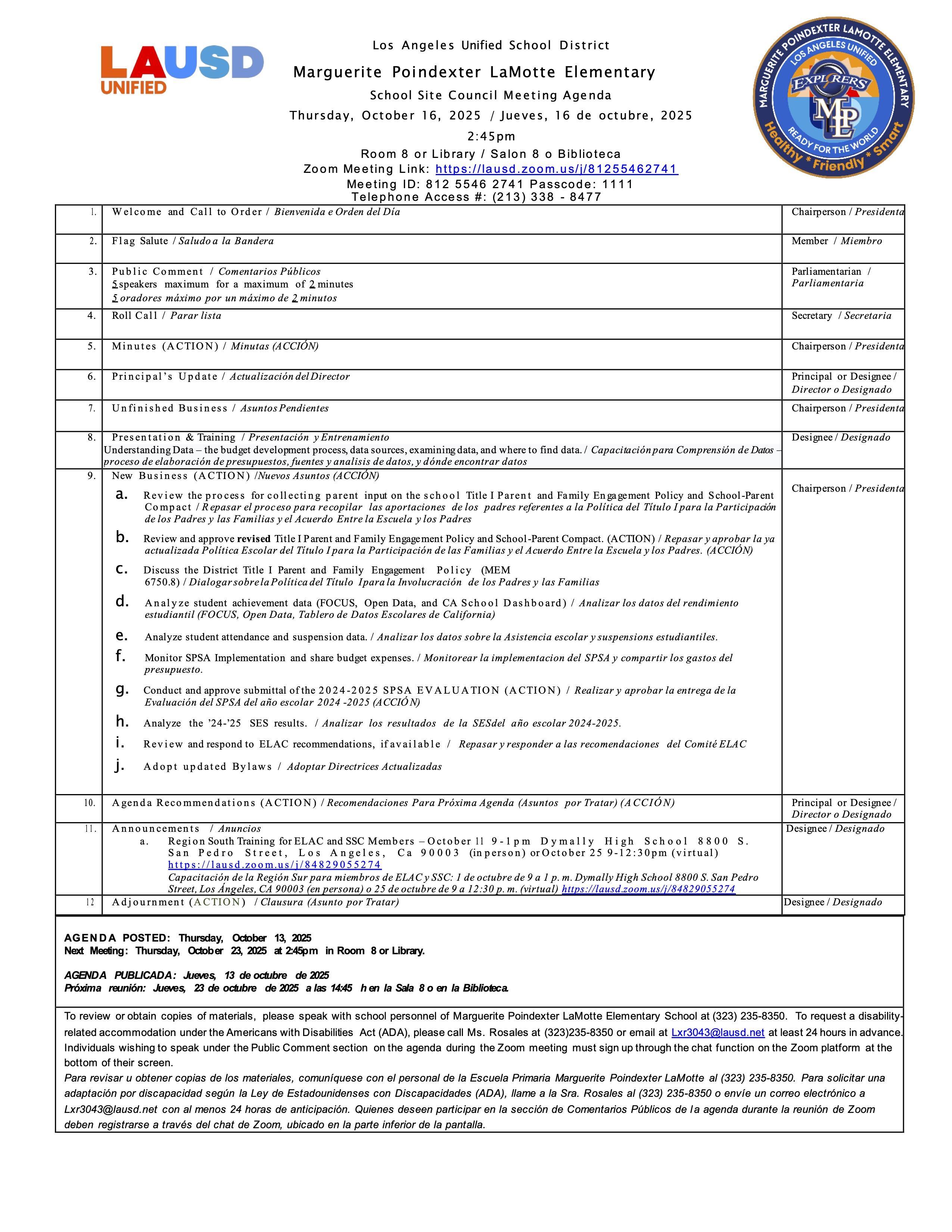 School Site Council Meeting 10/16 2:45PM
