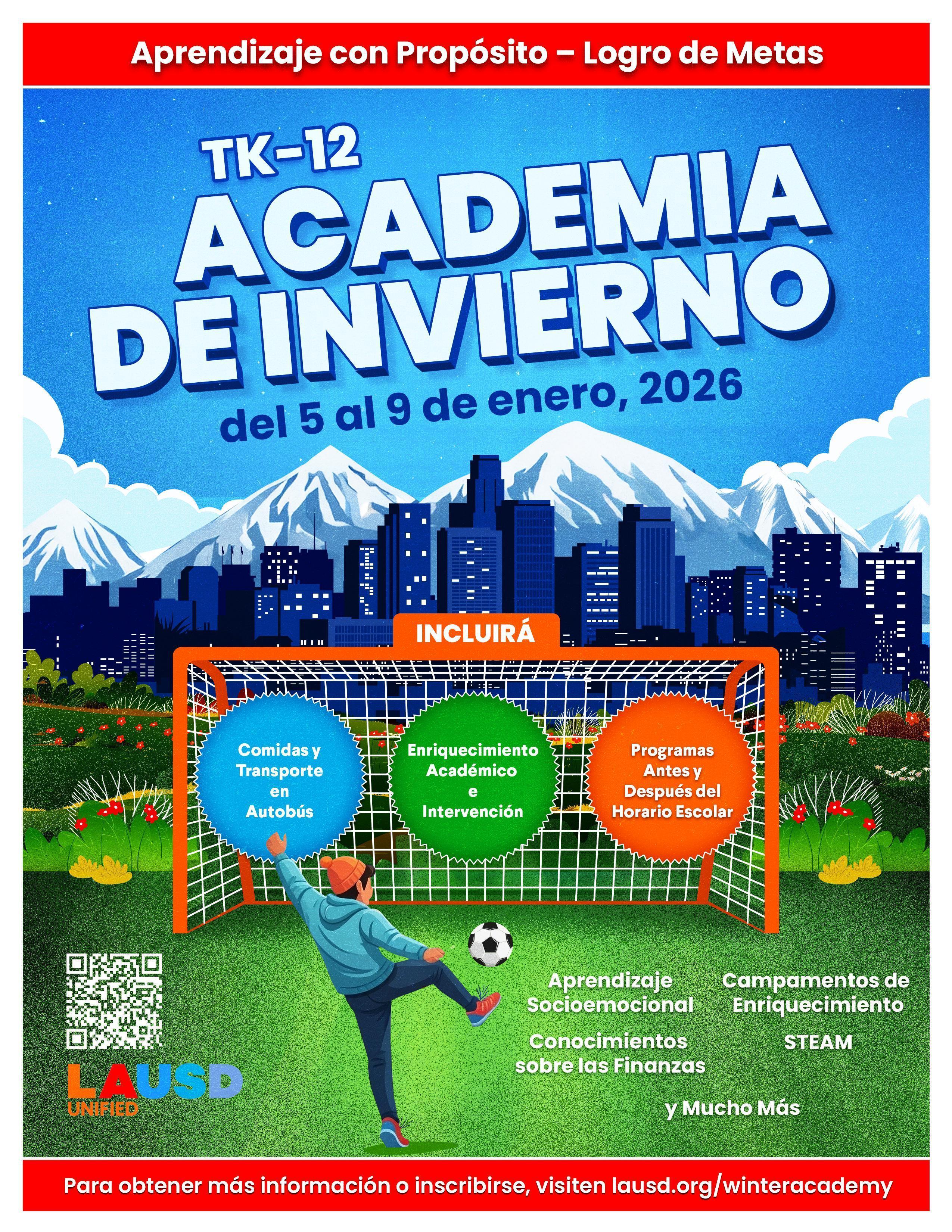 UTK–12 students will enjoy five full days of structured, personalized learning designed to support academic growth and enrichment—right during regular school hours. More information can be found at lausd.org/winteracademy.